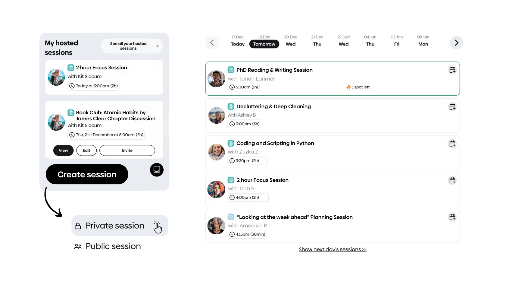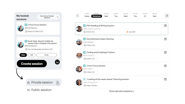 Create your own private focus sessions for friends, family or colleagues to join for FREE